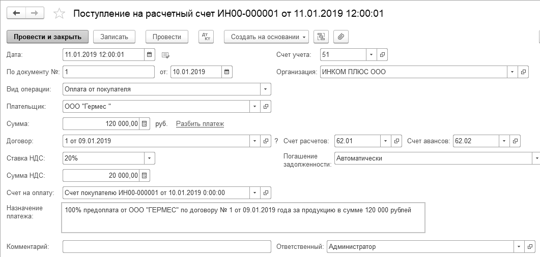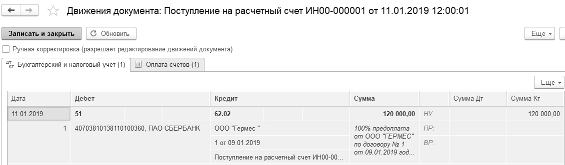 11.01.2019 года поступила 100% предоплата от ООО "ГЕРМЕС" по договору № 1 от 09.01.2019 года за продукцию в сумме 120 000 рублей. Создайте документ "Поступление на расчетный счет". Входящий номер платежного поручения покупателя ООО "Гермес" - № 1 от 10.01.2019 года (эта информация нужна для счета-фактуры на аванс).