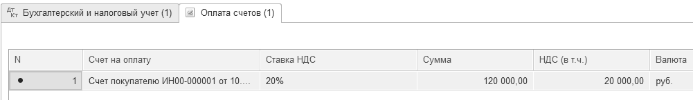 На закладке "Оплата счета" отражается информация (красный шар) о том, что счет оплачен. Если вернуться в список "Счета покупателям", то строка на сумму 118 000 руб. в списке будет окрашена зеленным цветом. Это и говорит о том, что счет оплачен. Красный цвет в списке – счет не оплачен.