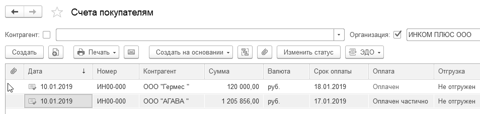 31.01.2019 года выписан счет ООО "АГАВА" на товары по договору № 4 от 31.01.2019 года. Действует до конца этого года (рис. 8.4.1.11).