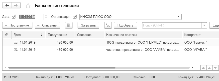 Обратитесь к журналу "Банковские выписки". Установите дату 11.01.2019 года. Проверьте наличие платежей от ООО "ГЕРМЕС" и ООО "АГАВА".