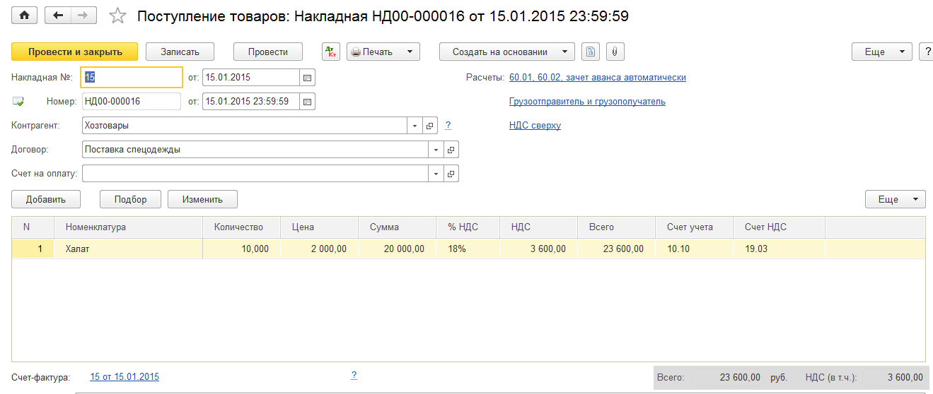 Поступление спецодежды, спецоснастки и хоз. инвентаря на склад ничем не отличается от поступления обычных материалов и товаров и отражается документом «Поступление товаров и услуг» с видом операции «Покупка, комиссия», находящийся на панели разделов «Покупки» в разделе «Покупки».