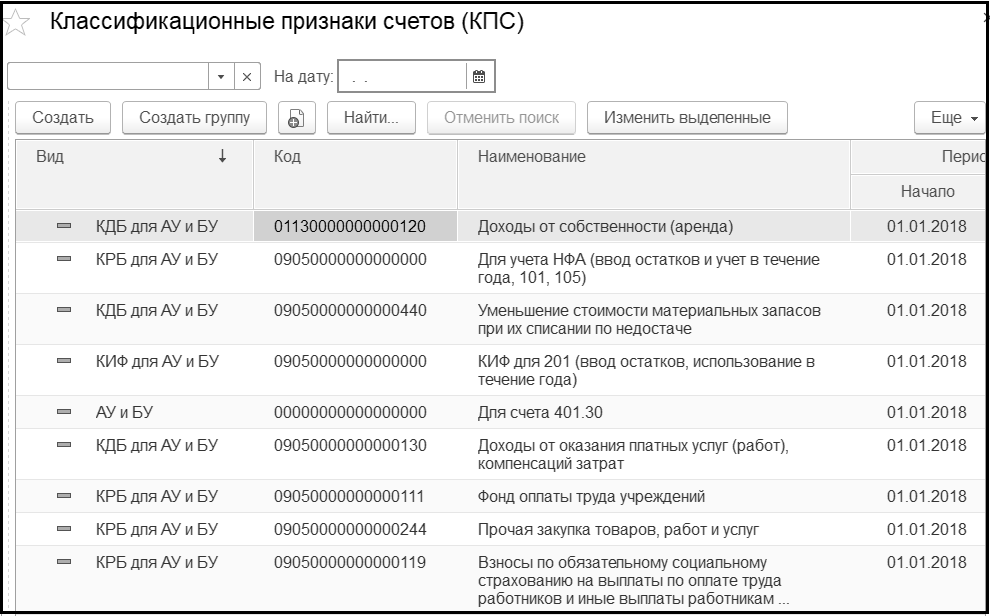 Перечень аналитических кодов по классификационному признаку поступлений и выбытий задается учреждением самостоятельно и закрепляется Учетной политикой учреждения на определенный период, поэтому для любого КПС следует указывать дату начала действия.