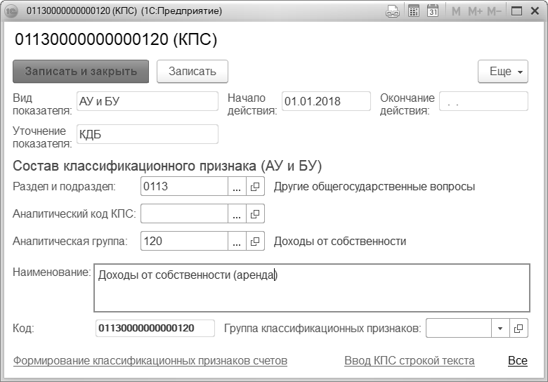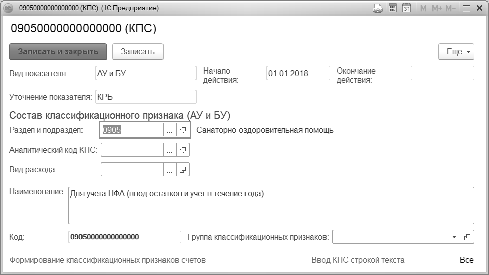 Аналитический код КПС - указываться код из произвольного классификатора, который применяется для ведения аналитики в соответствии с Учетной политикой учреждения. Если дополнительные аналитические коды в учреждении не применяются, реквизит Аналитический код КПС можно не заполнять.