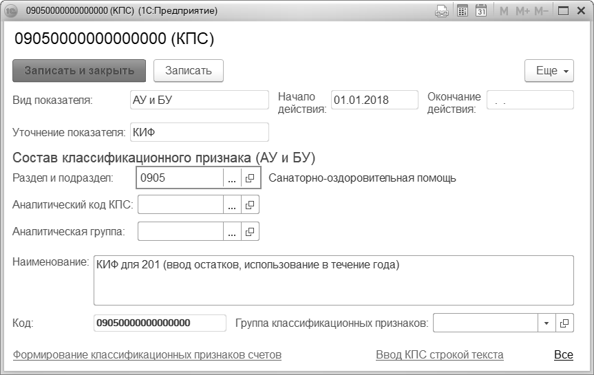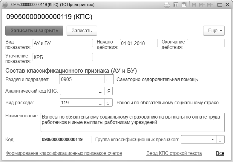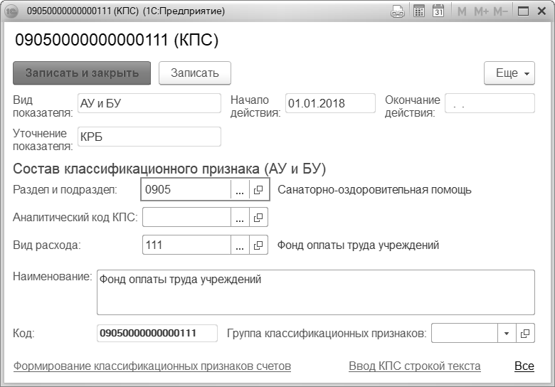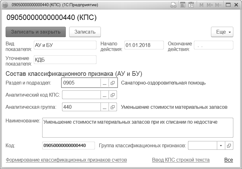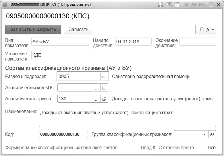 Для сохранения созданного КПС – кнопка Записать и закрыть.