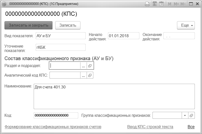 Откроем справочник "Классификационные признаки счетов (КПС)" (раздел Учет и отчетность) и введем новый элемент в справочник.