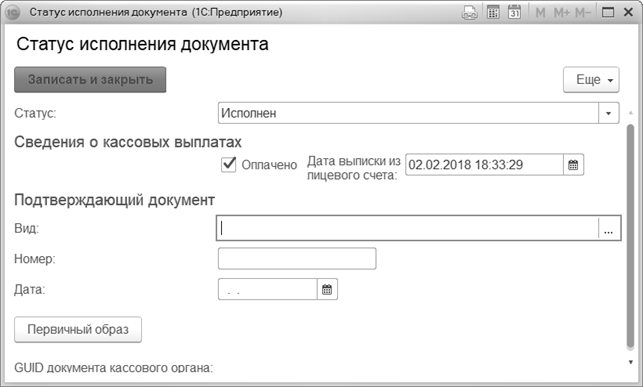 В группе Сведения о кассовых выплатах: поставить флаг Оплачено и указать дату выписки из лицевого счета.