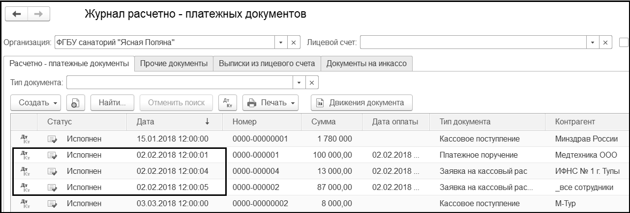 Документы "Заявка на кассовый расход", "Платежное поручение" и "Заявка на кассовый расход (сокращенная)" от 02.02.2018 следует провести.