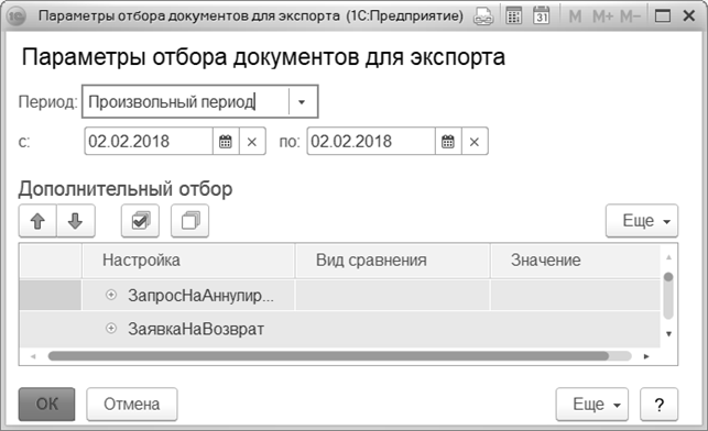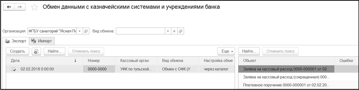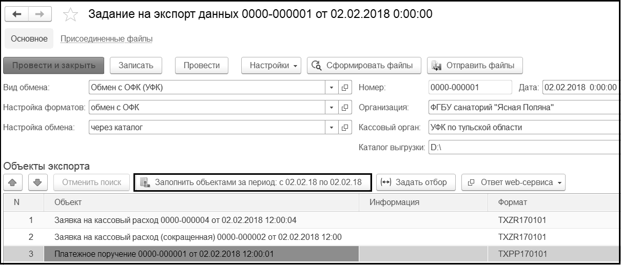 Выгружаемые объекты – Заявка на кассовый расход, Платежное поручение, Заявка на кассовый расход (сокращенная) – документы, созданные в предыдущих заданиях практикума со статусом Подготовлен и датой 02.02.2018.
