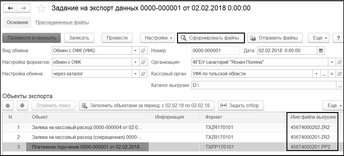Для формирования файлов экспорта следует нажать кнопку "Сформировать файлы" верней командной панели документа.