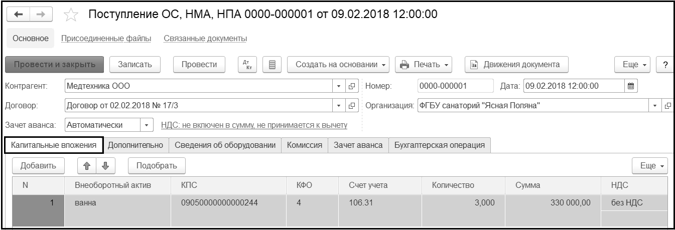 Выберем элемент справочника (Ванна) и возвращаемся в документ "Поступление ОС, НМА, НПА".