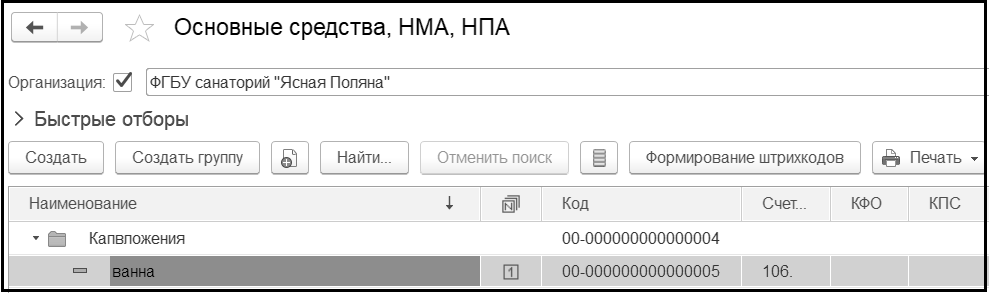 Напомним, что в Практикуме №14 была создана группа "Капитальные вложения" и элемент справочника ОС "Ванна", с Видом НФА - "Капитальные вложения":