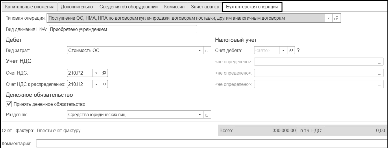 На закладке Бухгалтерская операция из списка типовых операций выбираем операцию Поступление ОС, НМА, НПА по договорам купли-продажи, договорам поставки, другим аналогичным договорам.