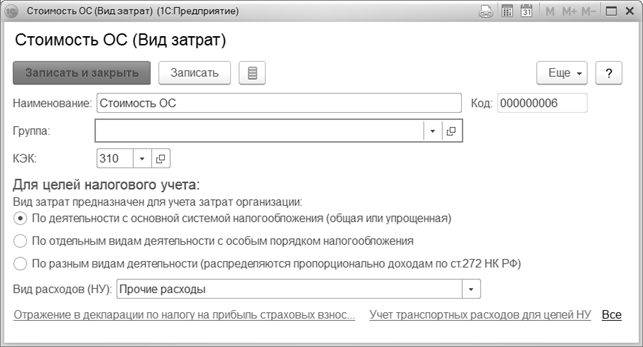 Заполняем необходимые реквизиты: Вид затрат – Стоимость ОС (элемент справочника Виды затрат).