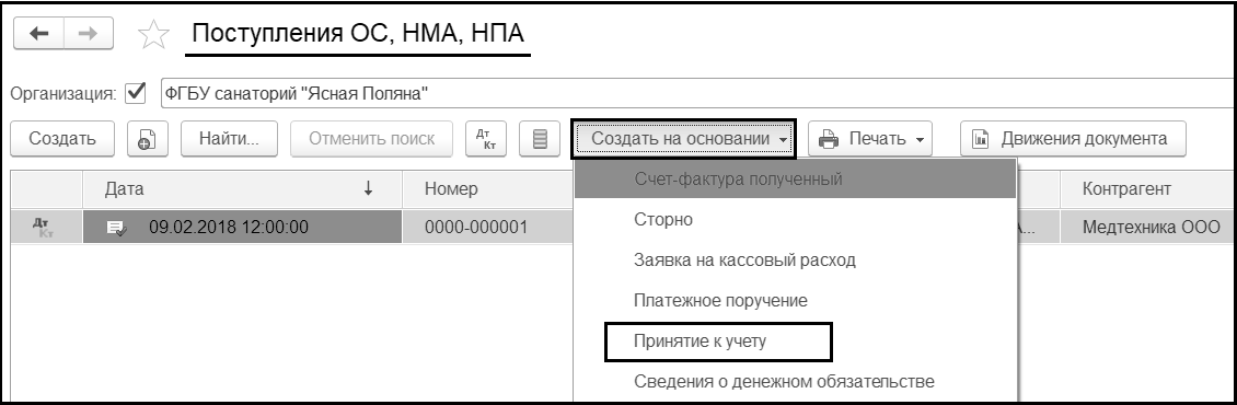 Для этого в списке документов Поступления ОС, НМА, НПА установим курсор на документ-основание, далее кнопка Создать на основании (на командной панели списка документов) и выбрать Принятие к учету.