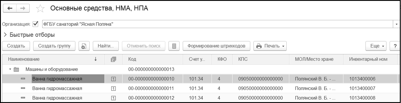 На данном этапе вводится информация об объектах основных средств, принимаемых к учету. Формируются новые элементы справочника Основные средства – ванна гидромассажная (их должно быть три).