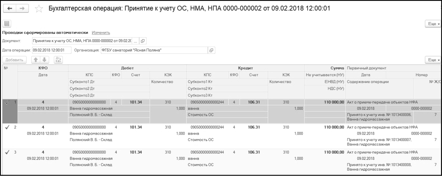 Откроем документ Принятие к учету ОС, НМА, НПА и по кнопке просмотрим сформированные проводки: