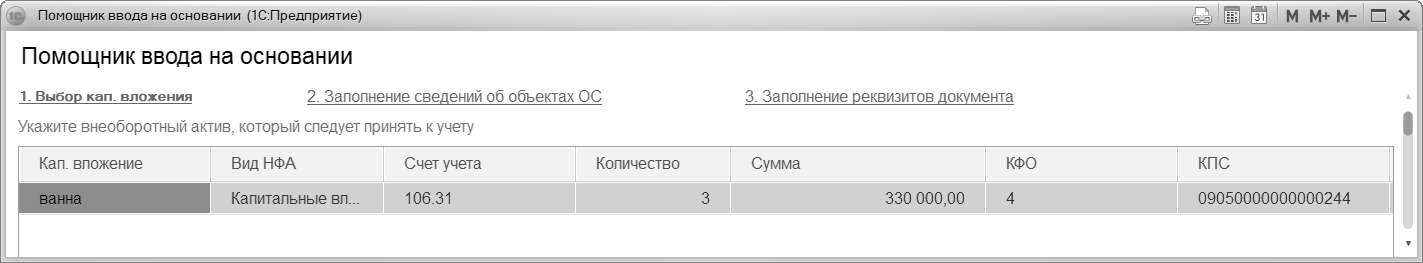 На 1-м этапе - Выбор капвложения - указываем внеоборотный актив, который следует принять к учету (заполняется автоматически).