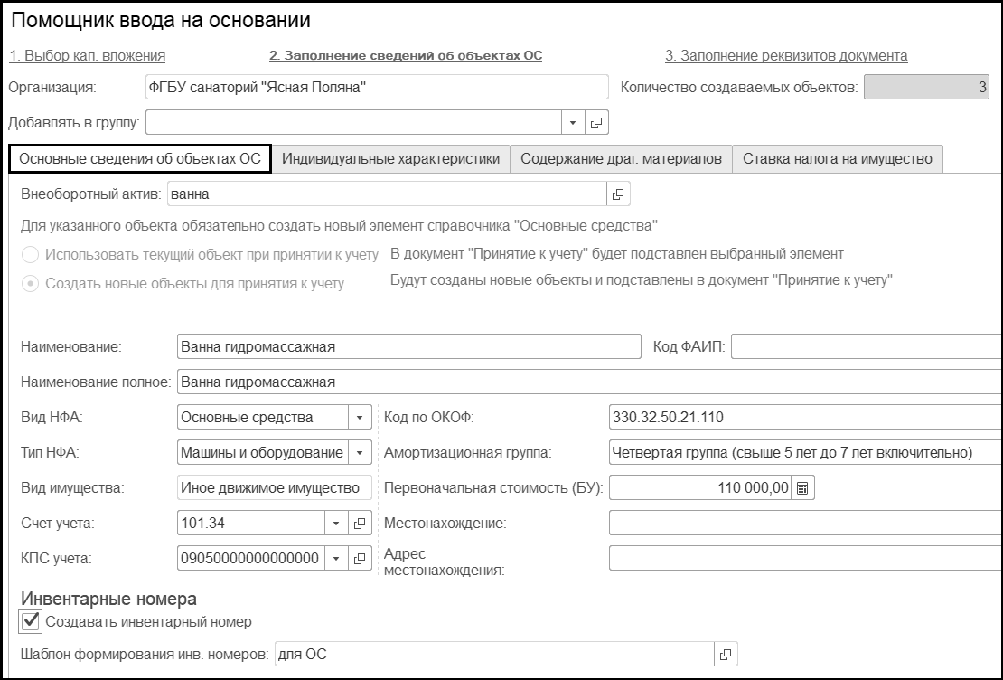 Количество создаваемых объектов – 3, каждому будет присвоен инвентарный номер, сформированный по шаблону.