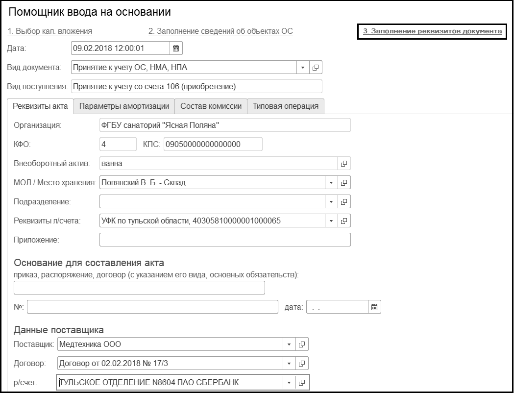 Заполняем реквизиты МОЛ, реквизиты лицевого счета, остальные заполнены автоматически.