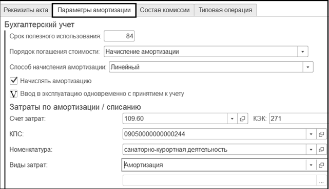 Срок полезного использования – 84; Порядок погашения стоимости – Начисление амортизации; Способ начисления амортизации – линейный; V - Начислять амортизацию – заполнены автоматически.