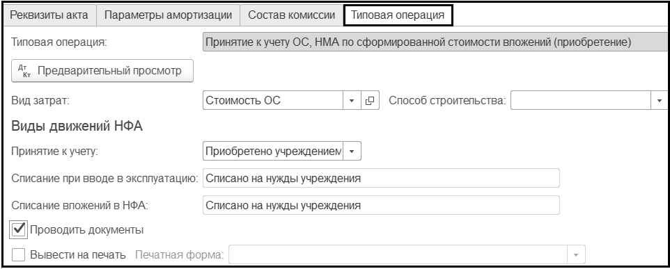 На данной закладке выбираем типовую операцию - Принятие к учету ОС, НМА по сформированной стоимости вложений (приобретение).
