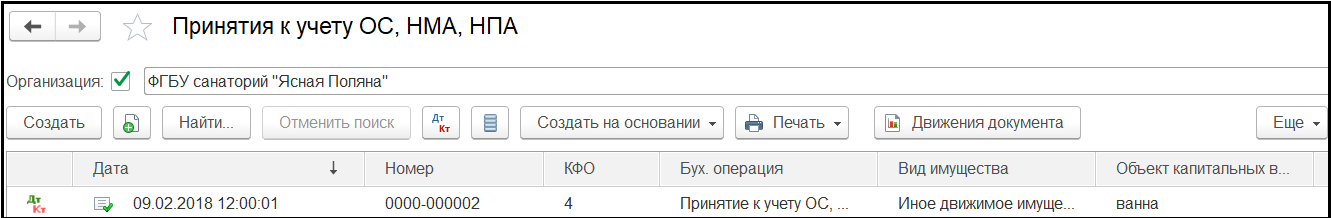 Вид документа – Принятие к учету ОС, НМА, НПА.