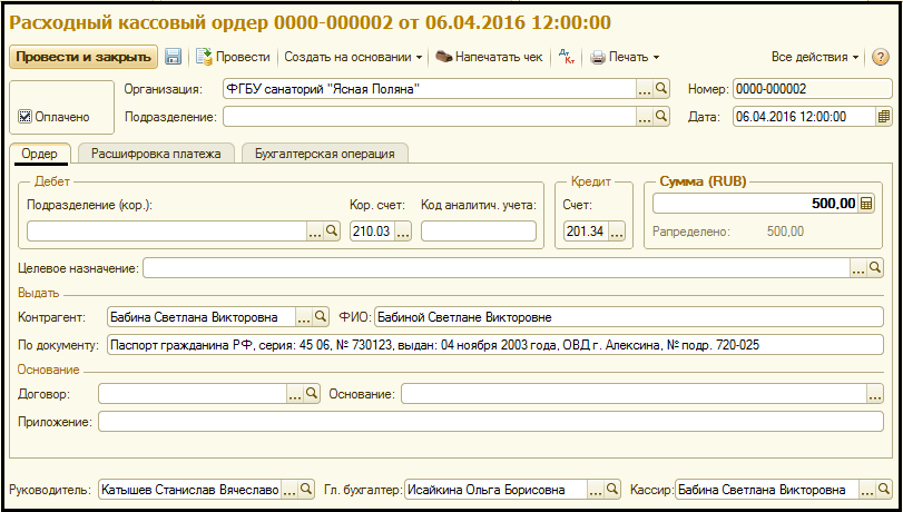 Для оформления хозяйственной операции выбытия денежных средств в валюте Российской Федерации из кассы учреждения для зачисления на лицевой счет в органе казначейства и формирования соответствующих проводок предназначен документ "Расходный кассовый ордер".