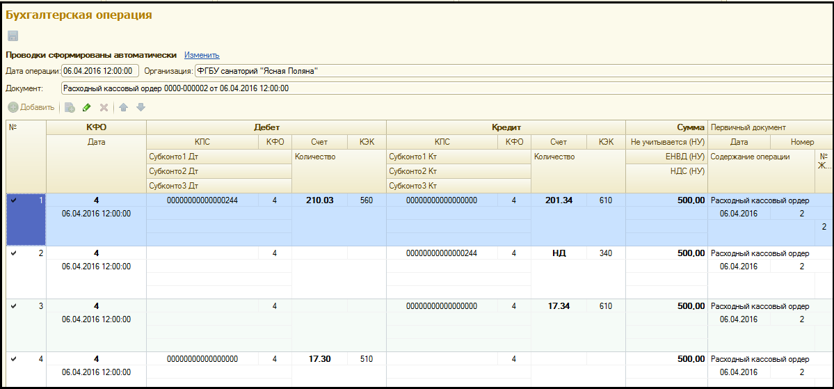 В результате проведения документа "Кассовое поступление" формируются следующие проводки: