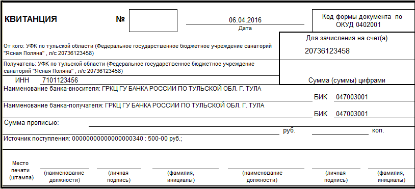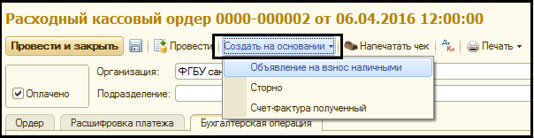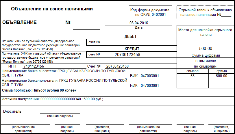 После заполнения всех реквизитов при помощи кнопки "Печать" формируется бланк ф. 0402001 "Объявление на взнос наличными".