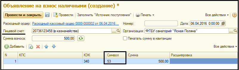 При вводе на основании расходного кассового ордера Объявления на взнос наличными требуется указать Лицевой счет, на который вносятся наличные средства, а в табличной части – символы кассового плана поступлений наличных денежных средств. Остальные реквизиты будут заполнены автоматически.