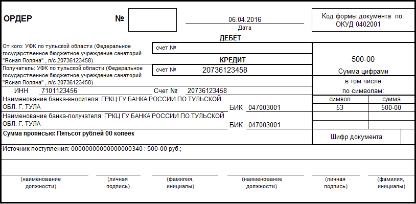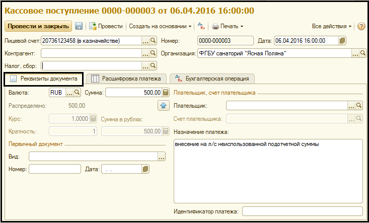 В форме документа указывается Лицевой счет, на который производится перечисление средств.