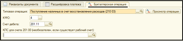 Выбираем типовую операцию: Поступление наличных в счет восстановления расходов (210 03) и заполняем реквизиты проводки.