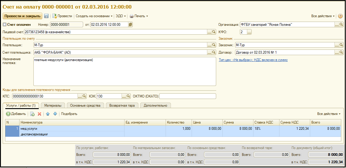 Выписать счет на оказание платных медицинских услуг, облагаемых НДС, по договору № 1 от 02.03.2016.