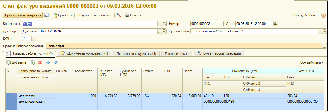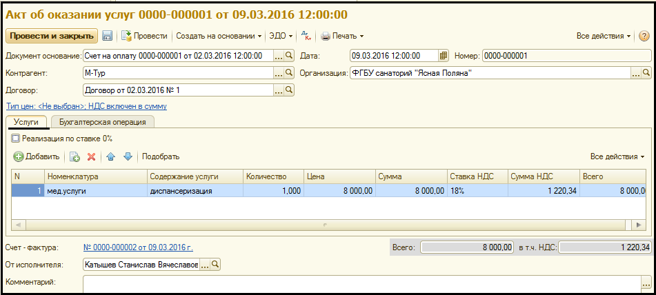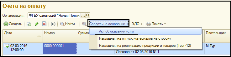 Используя режим ввода на основании, самостоятельно введите на основании документа "Счет", созданного в предыдущем практикуме, документ "Акт об оказании услуг" для отражения стоимости оказанных медуслуг в учете.