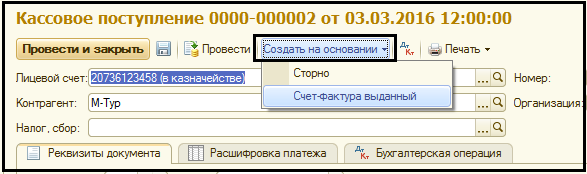 Откроем Журнал расчетно-платежных документов (панель действий Денежные средства). Найдем документ Кассовое поступление № 1 от 03.03.2016, откроем его и по кнопке Создать на основании создадим документ "Счет-фактура выданный".