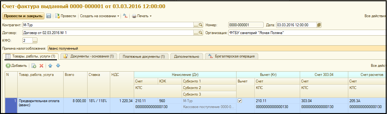 Оформите Счет-фактуру на аванс, полученный 03.03.2016 от ООО "М-Тур".