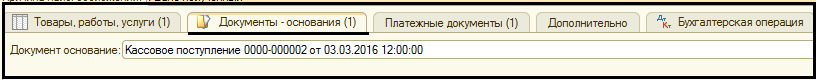 Здесь указывается документ-основание Кассовое поступление.