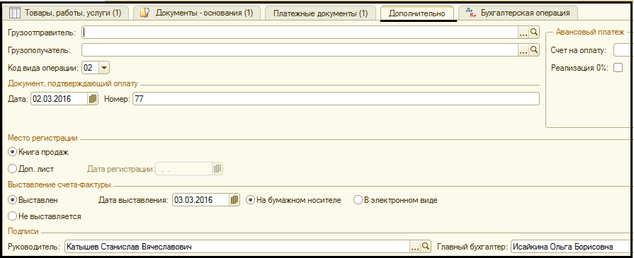 Выставление счета-фактуры - переключатель – Выставлен. Дата выставления 03.03.2016 г.