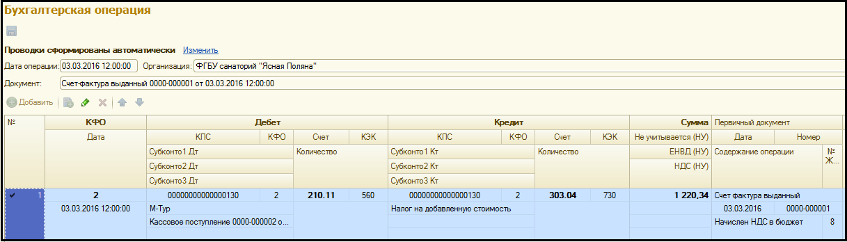 При проведении документ сформирует как проводки по учету НДС, так и сроку Книги продаж.