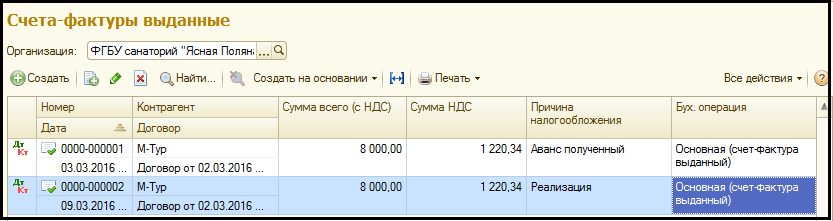 Список счетов-фактур выданных (на аванс и на реализацию):
