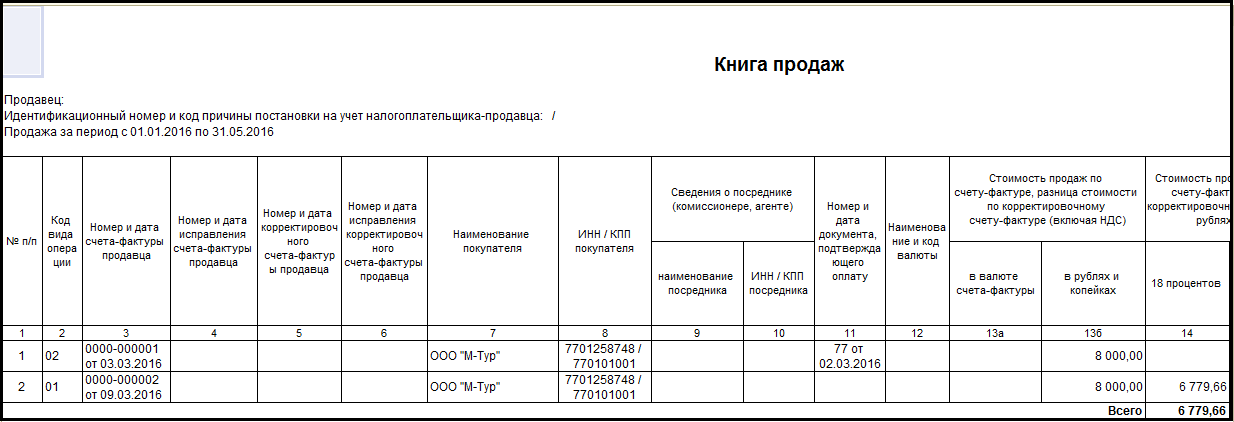 Фрагмент книги продаж.