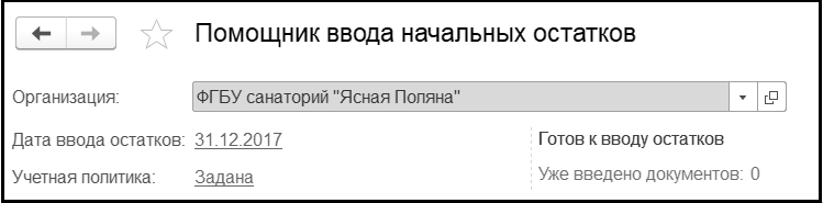 В заголовочной части Помощника укажем Организацию, Дату ввода остатков, убедимся, что Учетная политика: Задана и Помощник готов к вводу остатков.
