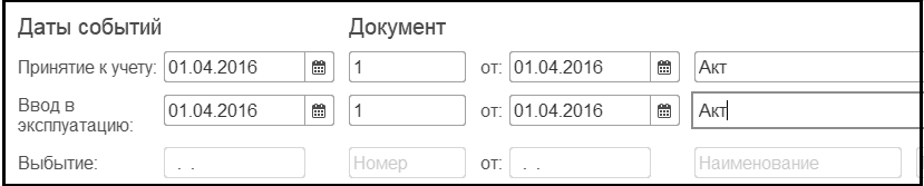 Далее вводим реквизиты группы Даты событий Документ: