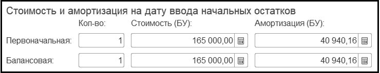 Следующие реквизиты группы Стоимость и амортизация на дату ввода начальных остатков: