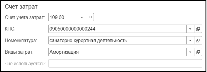 В реквизитах группы "Счет затрат" указываем полный счет учета для отнесения затрат по амортизации ОС. Следует выбрать синтетический счет 109.60 – Себестоимость готовой продукции, работ, услуг, т.к. основное средство Установка ингаляционная используется для реализации основной услуги нашего учреждения – санаторно-курортной деятельности. На данном счете ведется аналитический учет по объектам калькулирования себестоимости продукции, работ, услуг (субконто Номенклатура) и видам затрат (субконто Виды затрат).