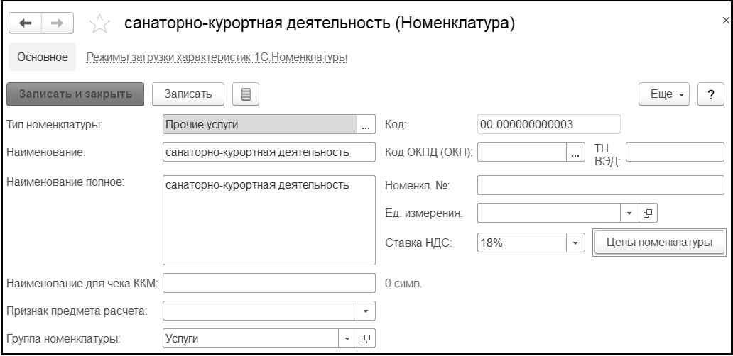 В справочнике Номенклатура (раздел Материальные запасы) вводим новый элемент – санаторно-курортная деятельность с типом номенклатуры Прочие услуги: