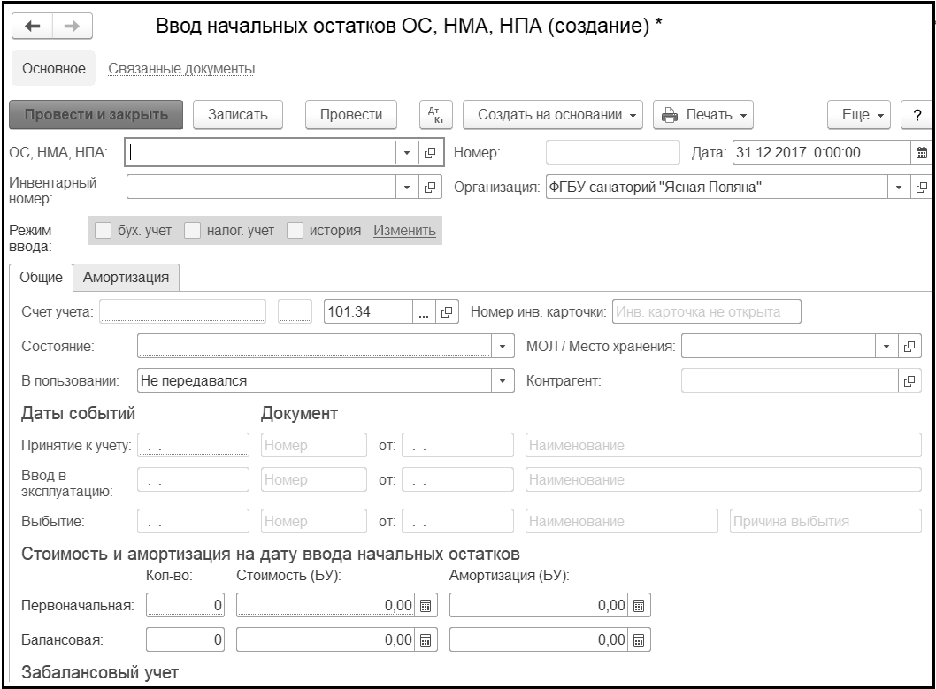 В открывшейся форме документа Ввод начальных остатков ОС, НМА, НПА заполняем реквизиты верхней части.
