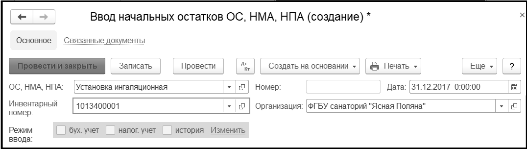 Возвращаемся в форму документа Ввод начальных остатков ОС, НМА, НПА и вводим инвентарный номер основного средства Установка ингаляционная - 1013400001.