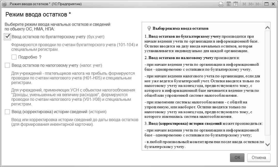 Далее по гиперссылке – Изменить переходим к выбору Режима ввода остатков – Ввод остатков по бухгалтерскому учету (бух.учет).