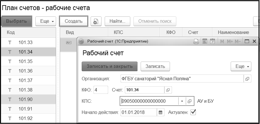 Далее установим курсор на строку со счетом 101.34 и нажмем кнопку "Ввести остатки по счету".